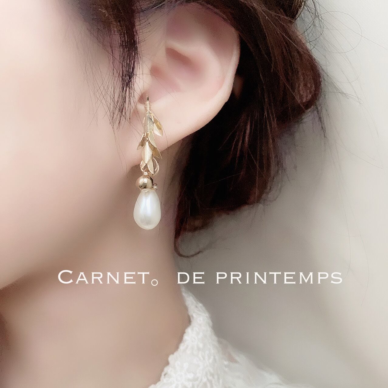 Oliveleaf ホワイト パール ゴールド リーフ 2wayイヤーカフ